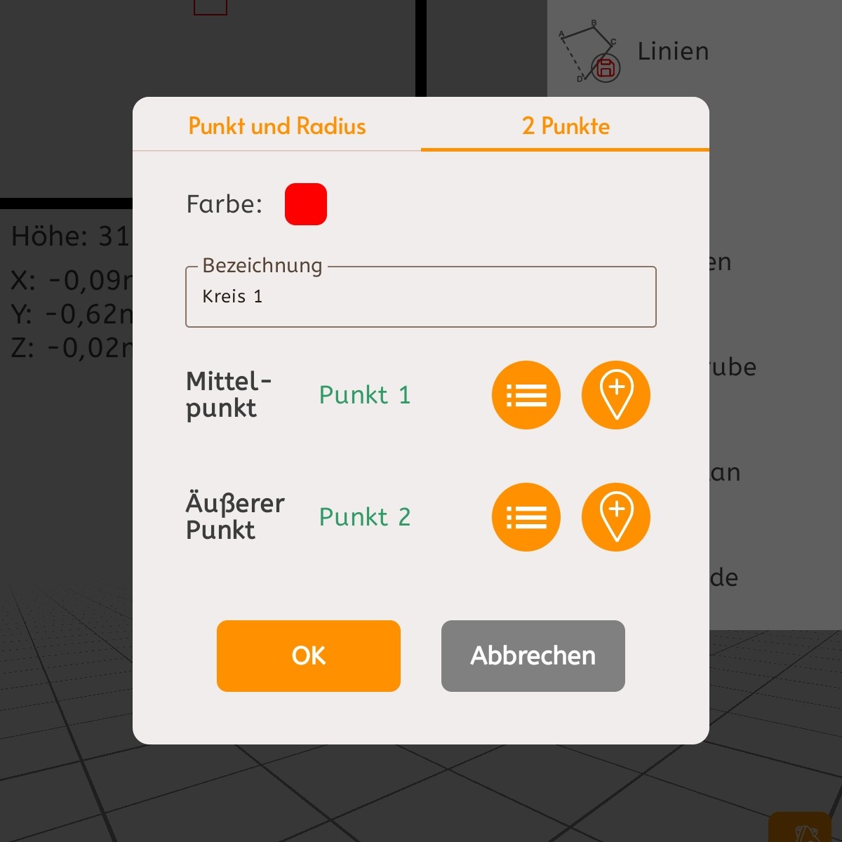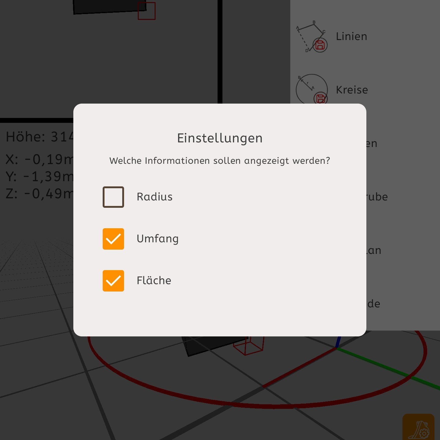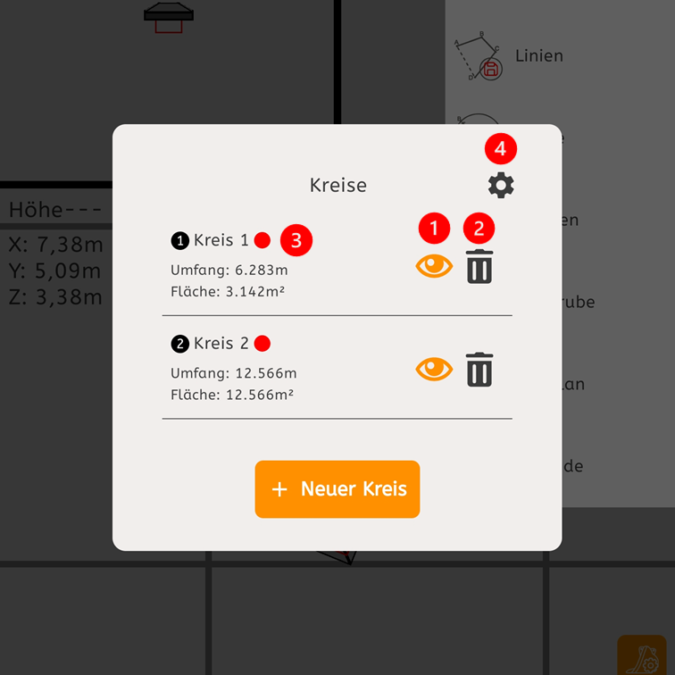 3: Linie bearbeiten | Durch Tippen auf einen Kreis können Sie diesen bearbeiten, z.B. die Farbgebung oder Bezeichnung. Unter der Kreisbezeichnung werden Ihnen alle Informationen zum Kreis (z.B. Umfang und Fläche) ausgegeben, welche Sie in den Kreis-Einstellungen (siehe 4) aktiv gesetzt haben.