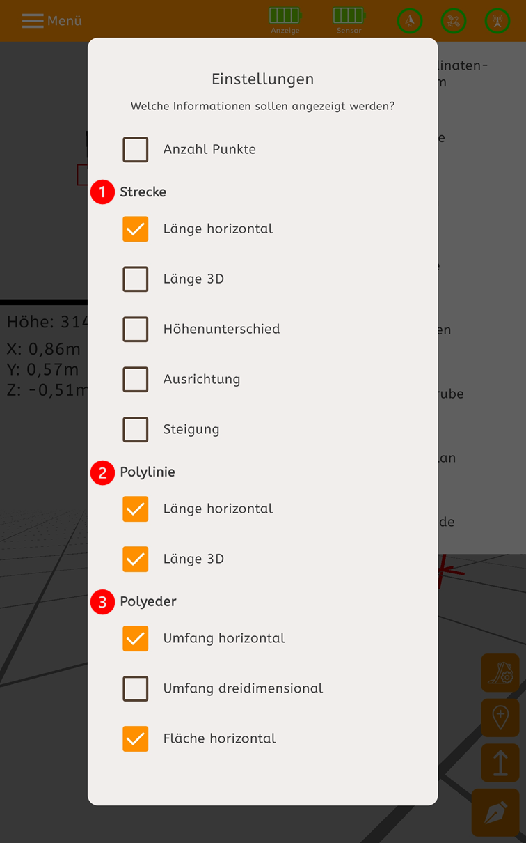 - Fläche horizontal: die eingeschlossene Fläche des Polyeders, hilfreich für die Mengenermittlung z.B. bei Pflasterarbeiten