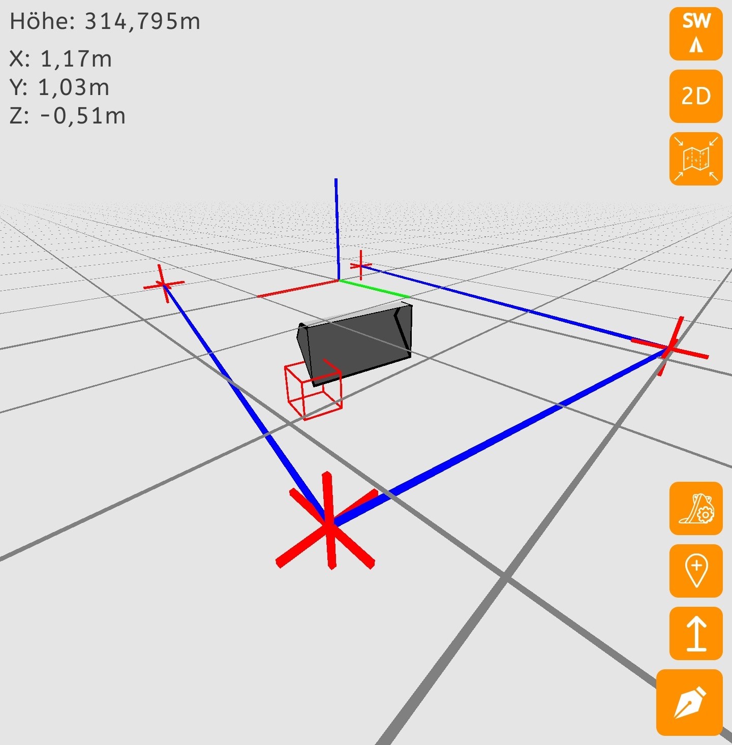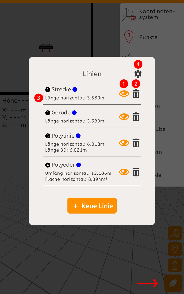 Mit Linien können Sie verschiedene Gegebenheiten Ihrer Baustelle direkt in der App selbst gestalten und darstellen – zum Beispiel, wenn sie keinen Bauplan oder kein Modell vorliegen haben. So lassen sich beispielsweise Baustellenbegrenzungen, Rohrleitungen oder Kanalwände einfach abbilden.