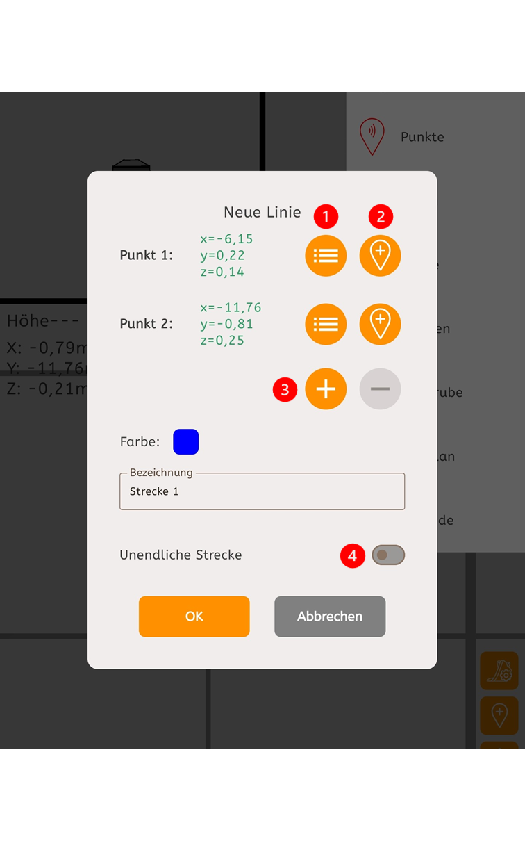 3: Linie bearbeiten | Durch Tippen auf eine Linie können Sie diese bearbeiten, z.B. die Farbgebung oder Bezeichnung. Unter der Linienbezeichnung werden Ihnen alle Informationen zur Linie (z.B. Länge der Linie) ausgegeben, welche Sie in den Linien-Einstellungen (siehe 4) aktiv gesetzt haben.