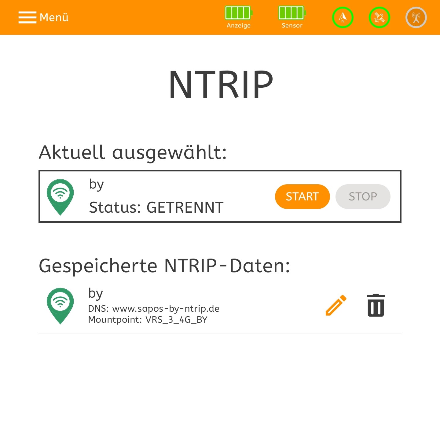 In der Kopfleiste befindet sich ganz rechts das Icon zur Darstellung des NTRIP-Empfangs. Die verschiedene Farbgebung weist auf den aktuellen Status der NTRIP-Verbindung hin.