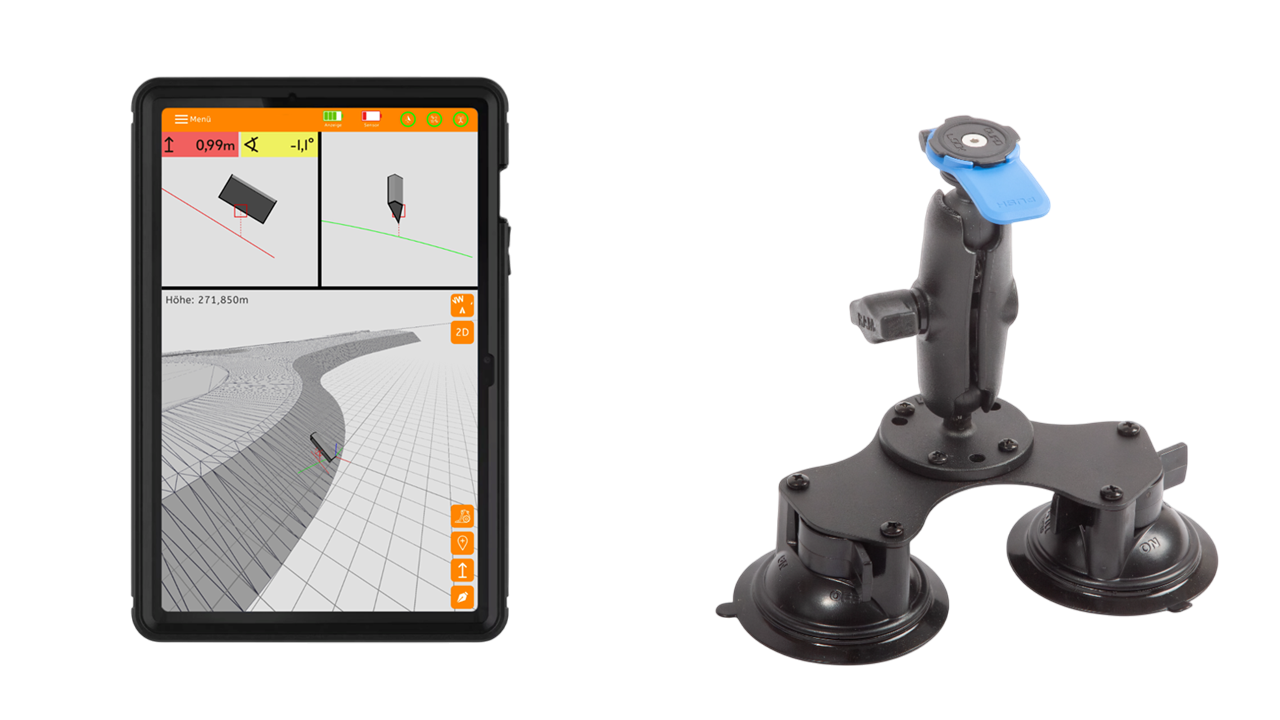 Das Tablet kann über eine Quadlock-Verbindung sowohl am Rover-Stab als auch im Führerhaus des Baggers mittels Saugnapfhalterung an der Innenseite der Kabinenscheibe befestigt werden.